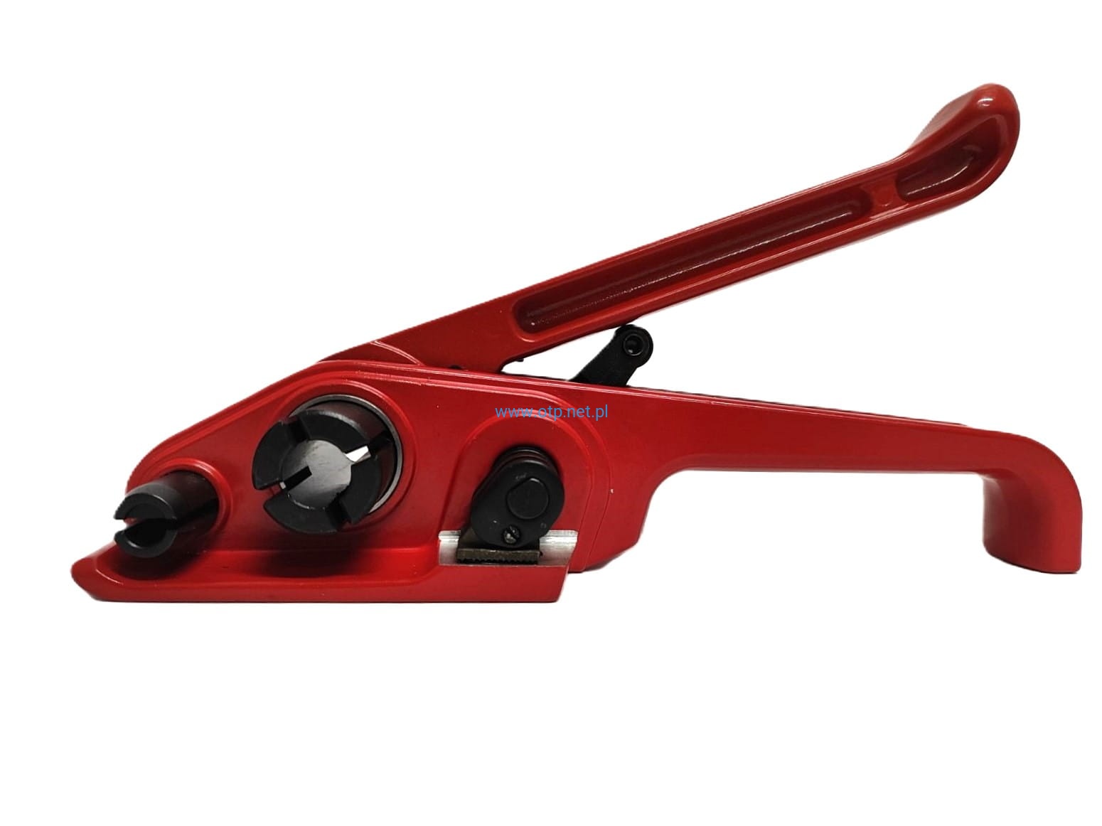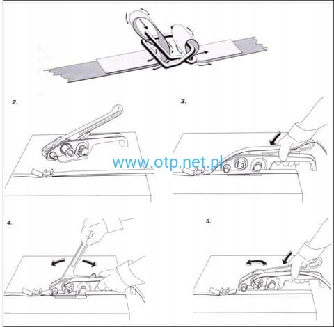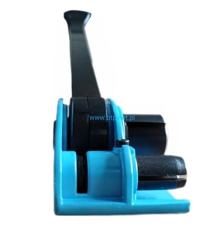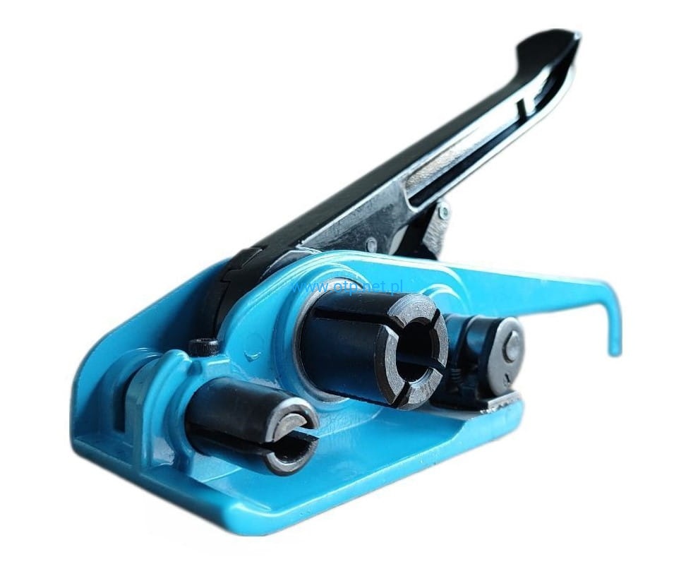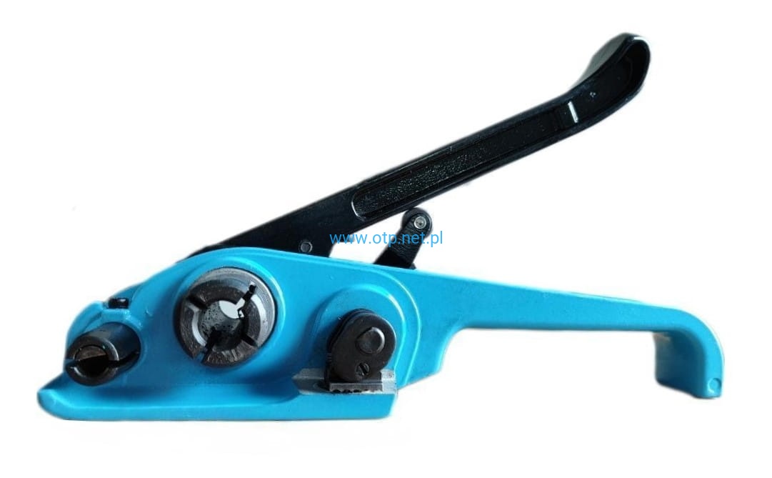 Wyposażony w perforowany docisk taśmy, zapobiegający wyślizgiwaniu się taśmy podczas napinania oraz mechaniczny nóż ucinający taśmę po napięciu.