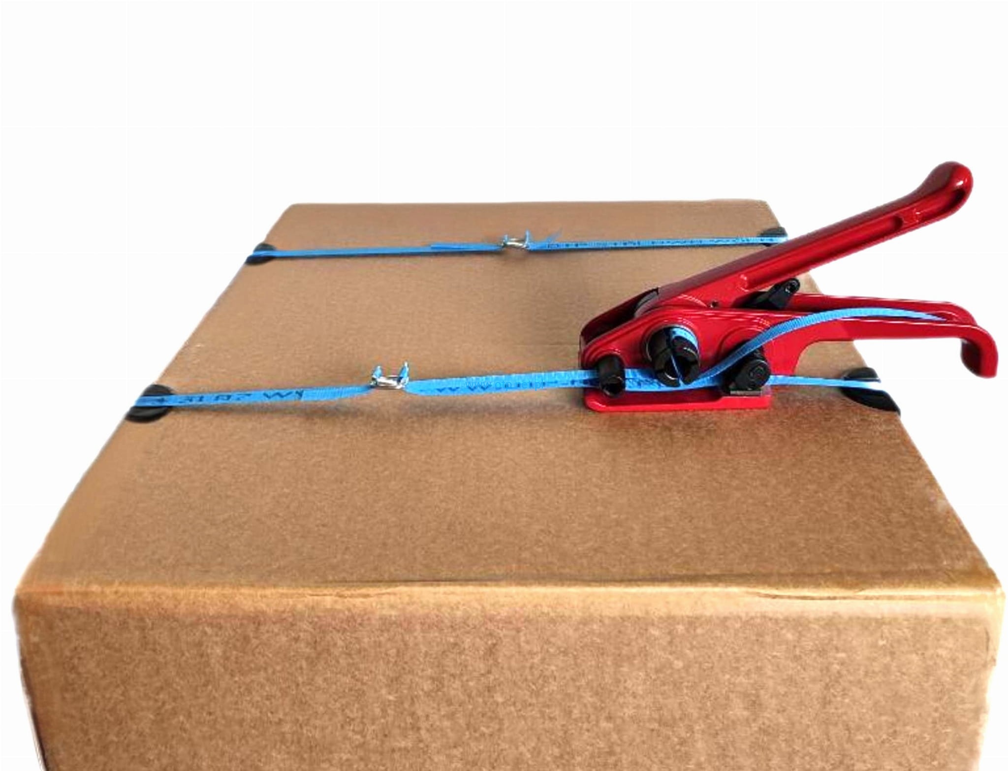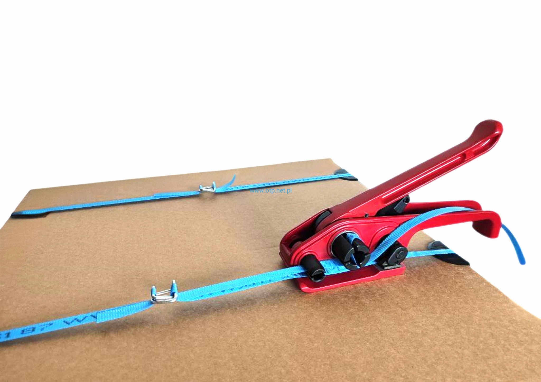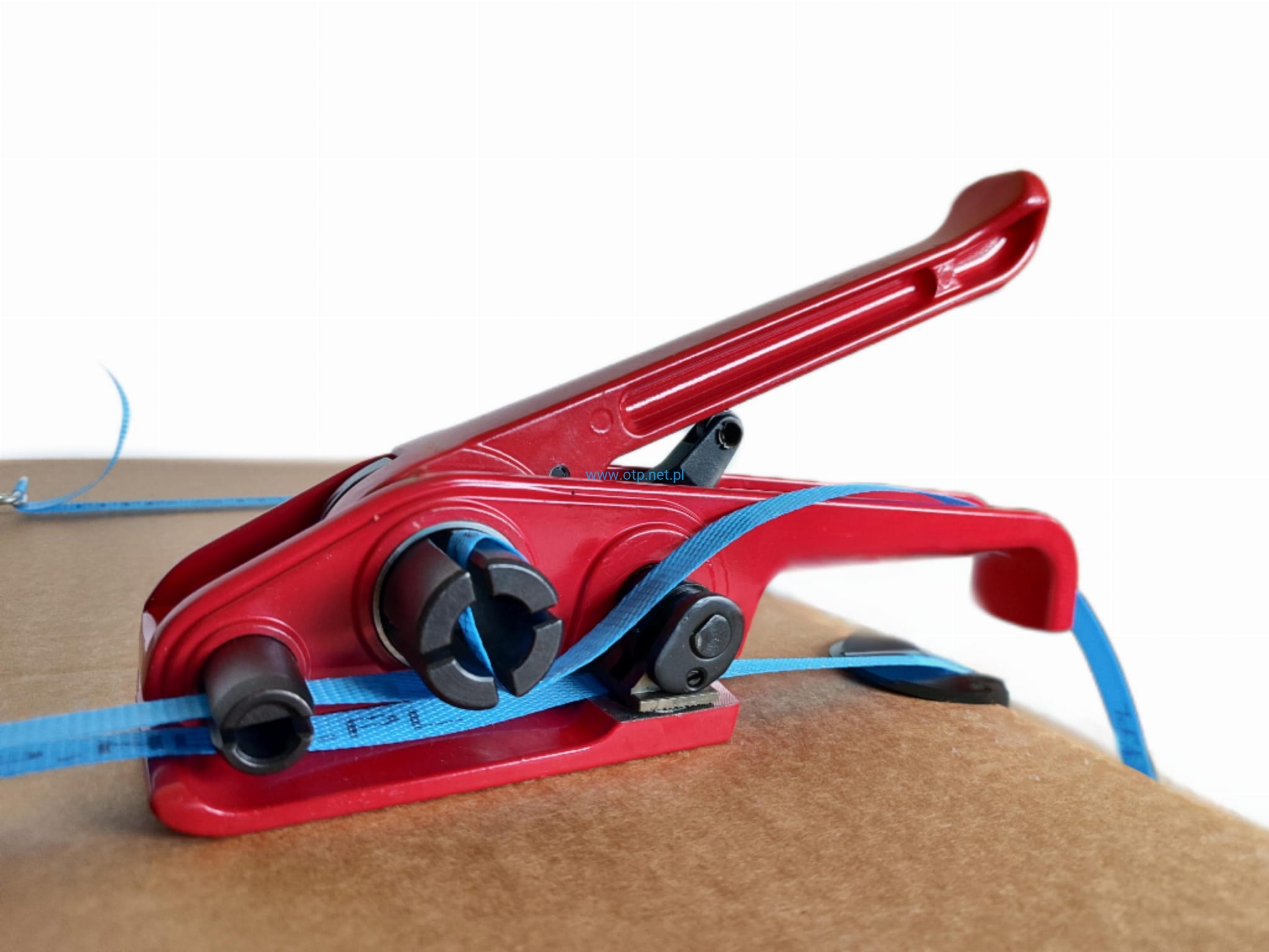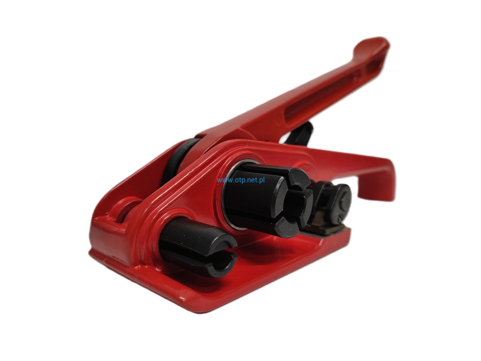 Wyposażony w perforowany docisk taśmy, zapobiegający wyślizgiwaniu się taśmy podczas napinania oraz mechaniczny nóż ucinający taśmę po napięciu.
